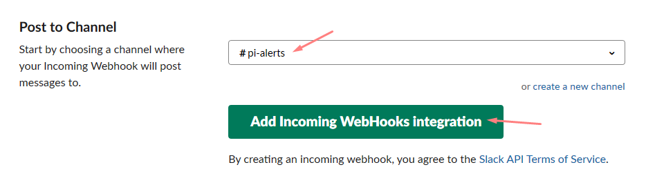 - Make sure that you selected the correct Channel and click the Add Incoming WebHooks integration button